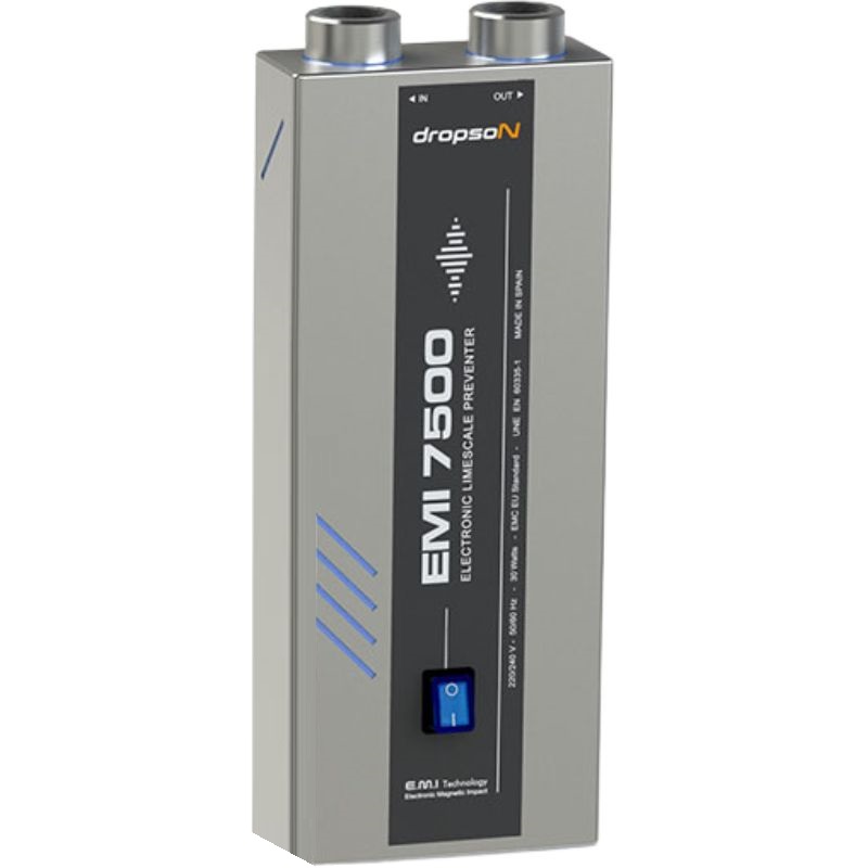 L'adoucisseur d'eau magnétique Dropson EMI 7500, d'une capacité de 9 m³/h, possède un boîtier et un châssis en acier inoxydable satiné. Cet adoucisseur d'eau électronique de nouvelle génération fonctionne sans sel, sans entretien et sans gaspillage d'eau. Il est conçu pour une installation dans les usines, les entreprises et les habitations.