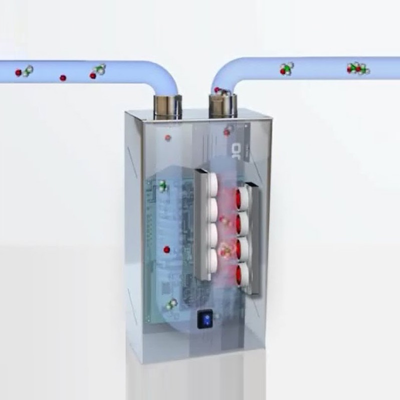 Entrée d'eau : Les ions calcium (Ca) et carbonate (CO3), responsables de la formation de calcaire, sont en suspension dans l'eau. Cristallisation : La combinaison des impacts magnétiques et de l'énergie cinétique du vortex induit la cristallisation des ions calcium et carbonate en suspension dans l'eau. Il est installé à l'arrivée principale d'eau froide et est accompagné d'un filtre et de manchons électrolytiques en fonction du matériau de la canalisation
