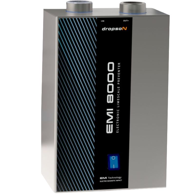 L'adoucisseur d'eau magnétique Dropson EMI 8000, d'une capacité de 9 m³/h, possède un boîtier et un châssis en acier inoxydable satiné. Cet adoucisseur d'eau électronique de nouvelle génération fonctionne sans sel, sans entretien et sans gaspillage d'eau. Il est conçu pour une installation dans les usines, les entreprises et les habitations.