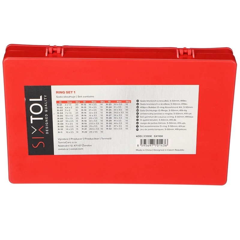 Joints toriques en caoutchouc Sixtol Mechanic RING SET 1, parfaitement disposés dans un coffret en plastique pratique, jeu complet de joints toriques Sixtol RING SET 1 avec 419 unités, conçus pour sceller les connexions dans la climatisation des voitures, les tuyaux d'air/d'aspiration, etc. Les bagues d'étanchéité sont en caoutchouc nitrile NBR, résistant aux acides, à l'essence, à la chaleur et aux huiles. L'ensemble comprend des joints toriques d'un diamètre intérieur de 4,4 mm à 38 mm.