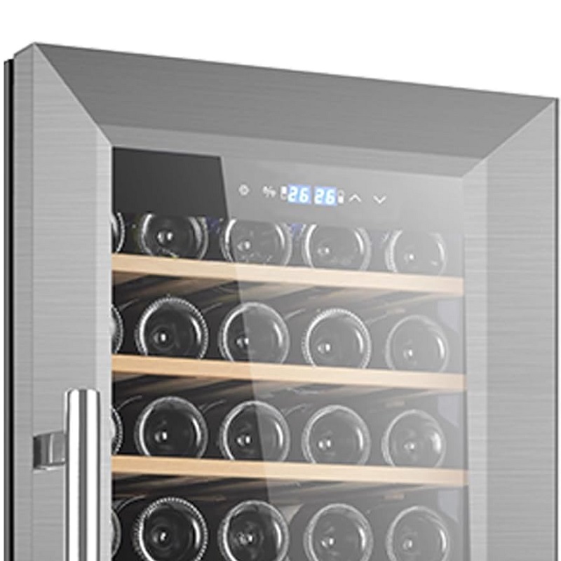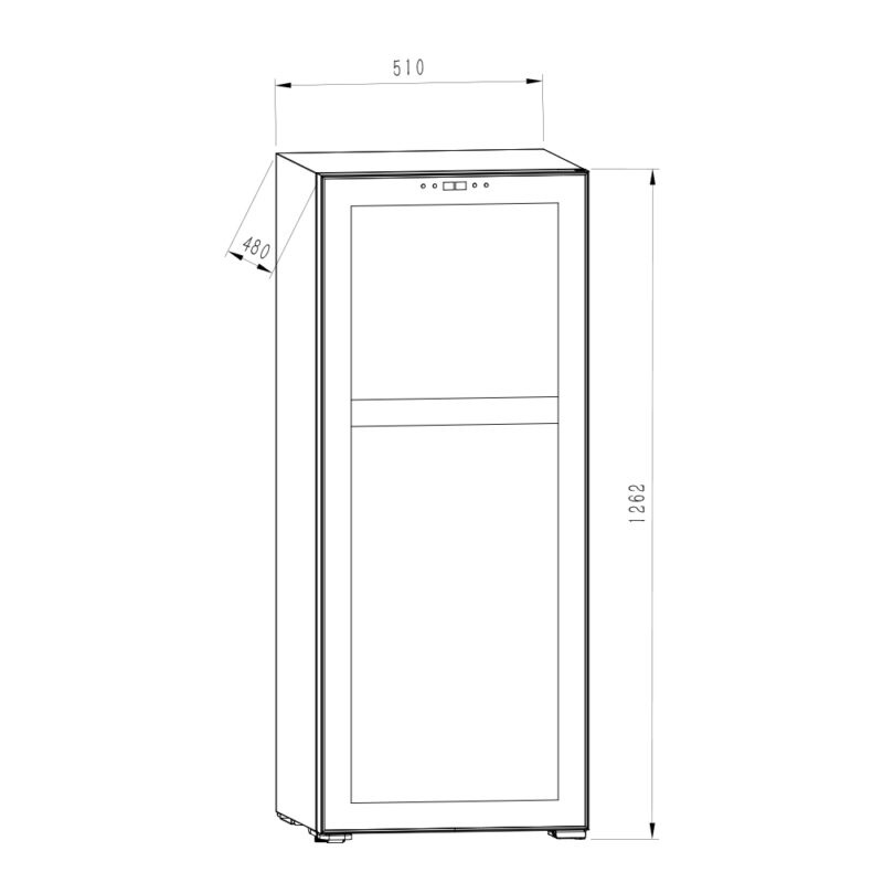 Cave à vin à refroidissement cyclique, moteur universel et fluide frigorigène R600a. Classe énergétique G et niveau sonore maximal de 45 dB. Design noir avec une porte vitrée unique, non réversible, munie d'une poignée. Deux zones de température. Système de commande tactile avec affichage LED et éclairage intérieur LED. Capacité totale de 150 litres ou 55 bouteilles, avec plusieurs compartiments pour un rangement optimal.