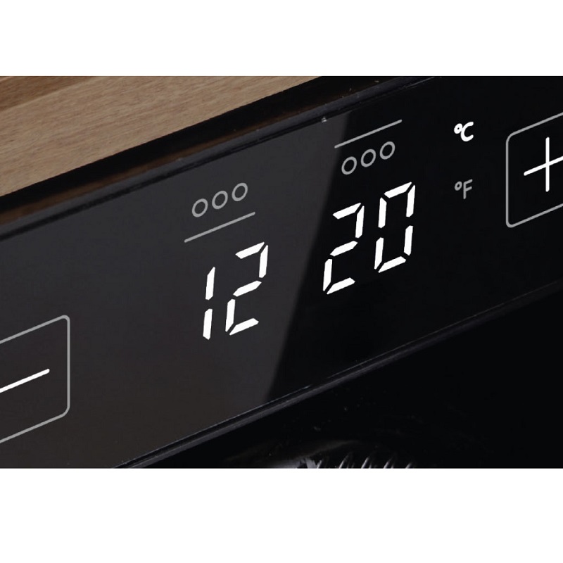 Température réglable grâce à un triple vitrage anti-UV et un filtre à charbon actif qui protège le vin de la lumière et des odeurs extérieures.