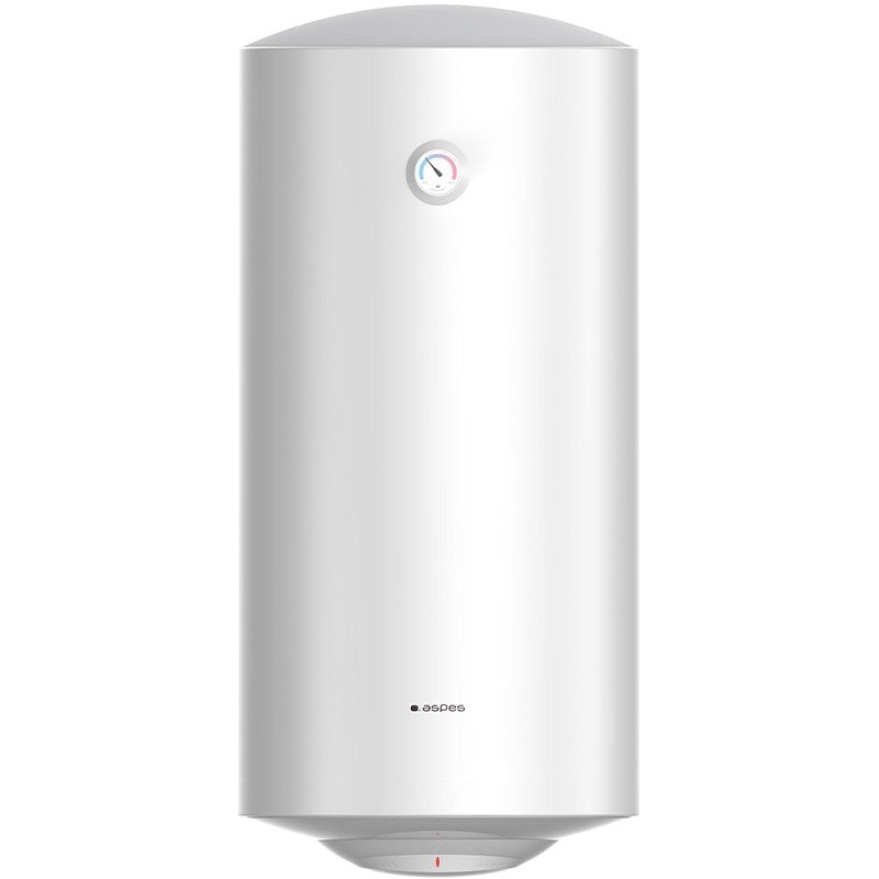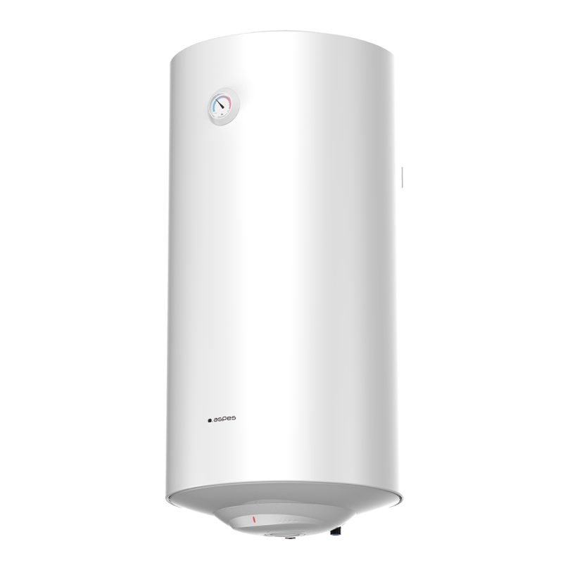 Chauffe-eau vertical avec réservoir de 100 litres et puissance totale de 1 500 W. Classe énergétique C et niveau sonore maximal de 15 dB. Finition blanche et intérieur en acier émaillé. Comprend un panneau de commande manuel, une température réglable jusqu'à 70 °C et un thermomètre analogique.