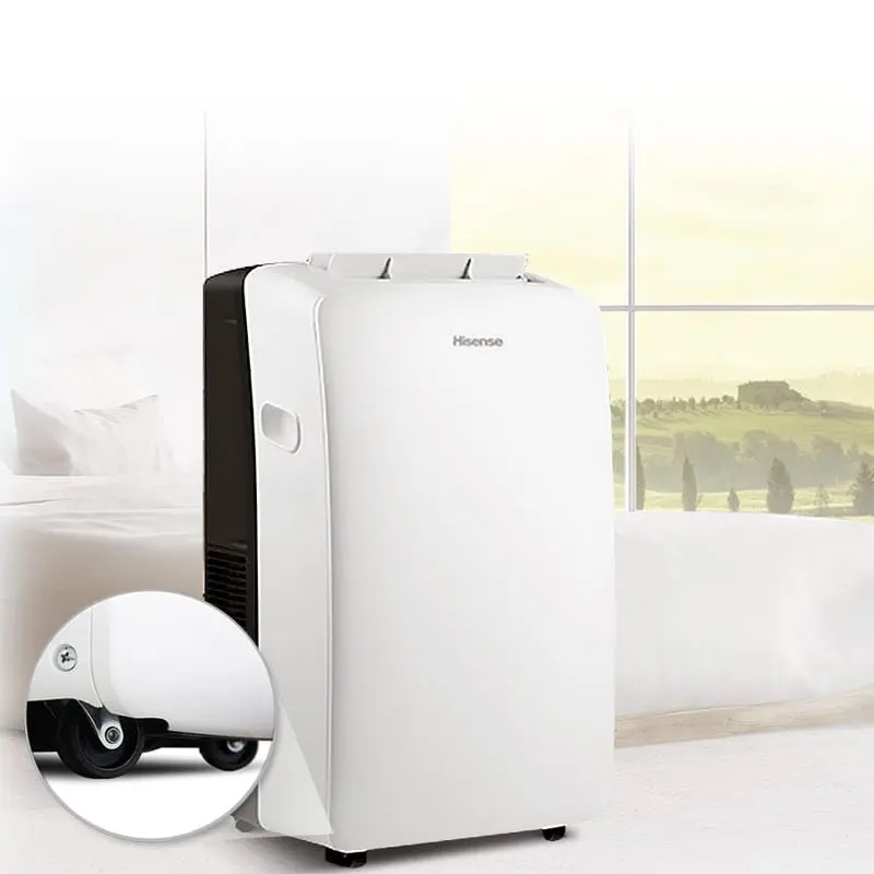 Le climatiseur portable Hisense APH09NJ refroidit, ventile et déshumidifie même les plus grandes pièces, déplacez-le confortablement grâce aux roues multidirectionnelles