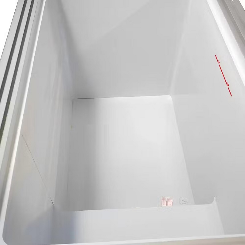Congélateur horizontal à porte vitrée NLFG-500 Edenox, comprend serrure avec clé et thermostat. Finition extérieure et intérieure laquée blanc, haute efficacité énergétique, isolation en polyuréthane injecté à haute pression (100% sans CFC)