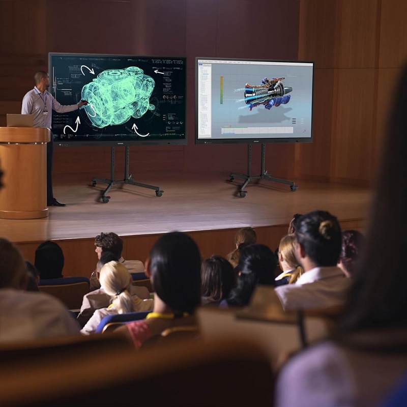 Le design intègre la technologie IR Touch pour une expérience tactile précise et naturelle, facilitant la collaboration et le travail en équipe. Le panneau présente une finition noire et offre une luminosité de 400 cd/m², assurant une visibilité optimale même dans des espaces très éclairés, et supporte une utilisation continue jusqu’à 12 heures par jour, 7 jours sur 7, ce qui le rend adapté aux usages intensifs. Côté connectivité, il intègre le Wi-Fi (norme 802.11ac), le Bluetooth ainsi que des options filaires comme HDMI OUT et USB-C, facilitant l’intégration de divers appareils externes et l’accès rapide à des contenus multimédias ou en ligne.