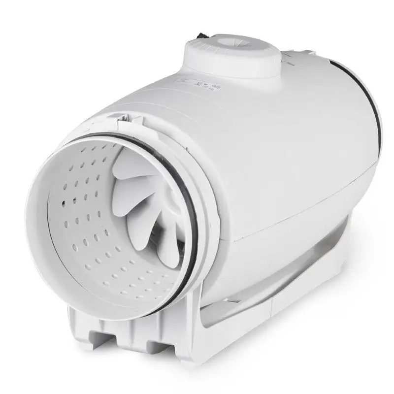 Ventilateur de conduit à flux mixte à profil bas avec isolation insonorisante, extrêmement bien, fabriqué en matière plastique, boîtier de connexion externe, vitesse 230V-50Hz contrôlable par moteur.