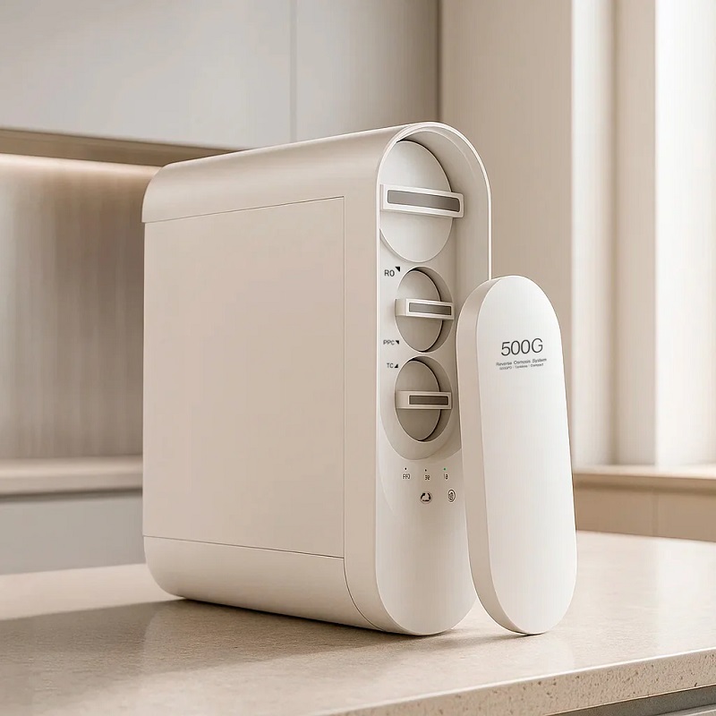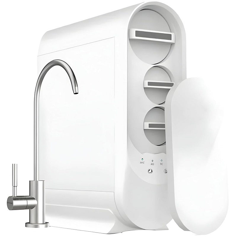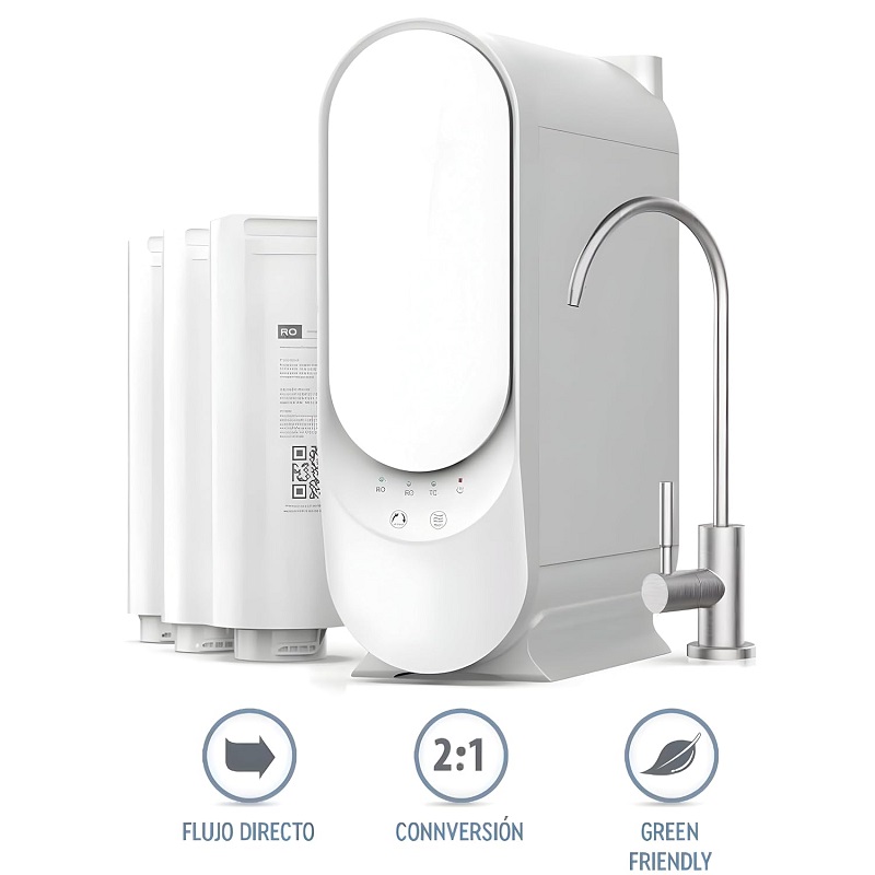 Purificateur d'eau : Le purificateur d'eau GALYON GENIUS D500 est équipé d'un système d'osmose inverse à 5 étapes. Il produit 1,5 à 1,7 l/min et possède une capacité de filtration de 500 GPD (gallons par jour) ainsi qu'un taux de rejet du sel supérieur à 90 %.