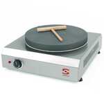 Machine pour réaliser des crêpes et des galettes de manière professionnelle, la crêpière est en acier inoxydable et la plaque est en fer antiadhésif avec un tube chauffant entourant, la plaque a un diamètre de 40 cm et une épaisseur de 18 mm et l'élément chauffant tubulaire répartit la chaleur uniformément sur la plaque, assurant une cuisson parfaite