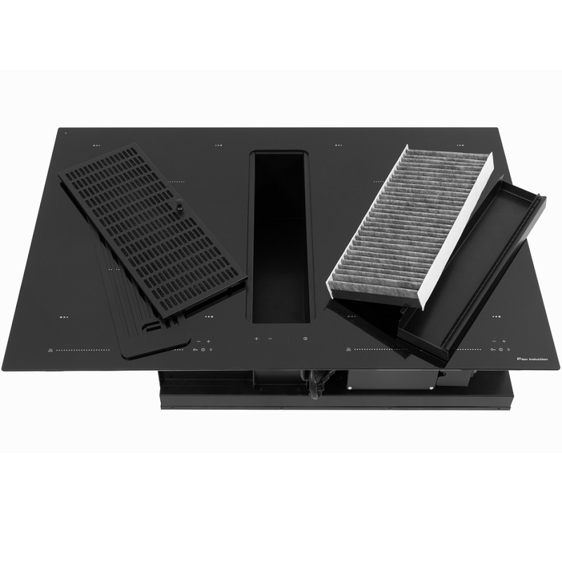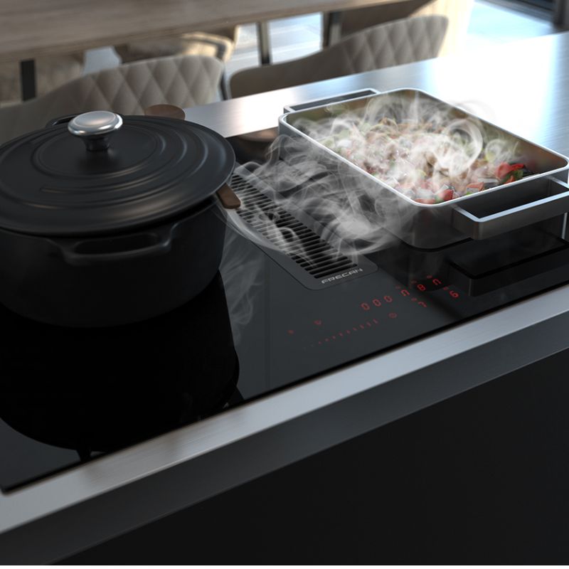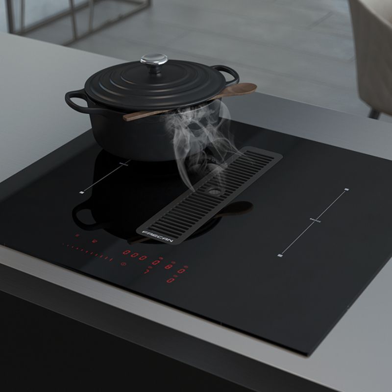 Nouvelle plaque à induction avec système d'aspiration intégré, R-Evolution. Découvrez une expérience culinaire inégalée avec la plaque à induction Flow 44 de 78 cm, équipée d'un système d'aspiration intégré. Son design élégant et avant-gardiste génère un puissant flux d'air, éliminant ainsi les odeurs indésirables. Sélection rapide de la température choisissez la puissance souhaitée d'un simple effleurement de l'écran tactile. Le même principe s'applique à la zone d'aspiration sélectionnez la puissance souhaitée.