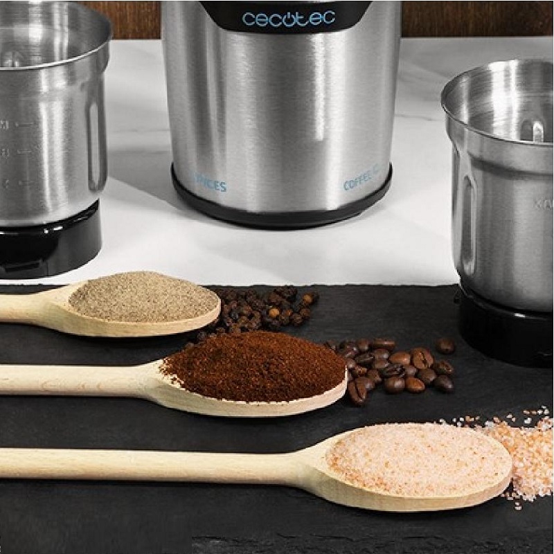 Lames avec revêtement en titane qui offre une meilleure dureté et maintient les lames affilées plus longtemps, 2 en 1, double fonction : ce moulin est capable de moudre et hacher ou broyer en changeant simplement de réservoir, il incorpore un verre pour la fonction moulin, avec lame de deux feuilles plates en titane qui peuvent moudre sans difficulté des ingrédients secs comme du café, du poivre, des graines, du sel... il inclut un second verre pour la fonction hacher et broyer, avec une lame de quatre feuilles en titane qui peuvent triturer facilement des ingrédients humides comme des fruits secs, des herbes aromatiques, de l’ail, de petites quantités de gingembre, des légumes et de la viande.