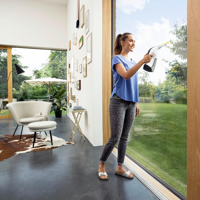 Comme de coutume, la combinaison astucieuse du pulvérisateur et de la bonnette en microfibres ainsi que la fonction d'aspiration du nettoyeur de fenêtres garantissent un nettoyage très efficace et des vitres étincelantes, sans traces ni résidus, En outre, le nettoyeur de fenêtres sans fil WV 6 Plus, ergonomique, permet un nettoyage des vitres particulièrement hygiénique, l'utilisateur n'étant jamais en contact direct avec l'eau sale.