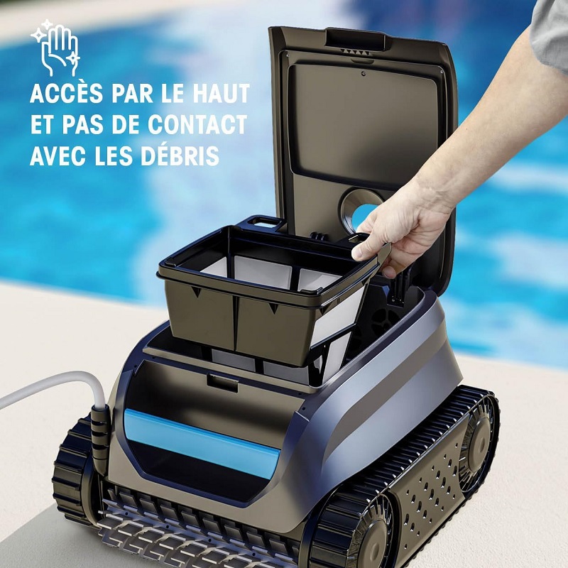 Grâce à l'aspiration cyclonique, une exclusivité brevetée par Zodiac, SWY 3500 excelle dans sa fonction de nettoyage : cela assure une force d'aspiration constante durant le cycle, permettant au robot de nettoyer méticuleusement le fond, les côtés et la ligne d'eau, en capturant les impuretés de manière très efficace. Le SWY 3500 se distingue par sa simplicité d'utilisation. Son filtre de 3 litres, situé au-dessus du robot, se retire très facilement pour un nettoyage rapide à l'eau, éliminant de fait le besoin de manipuler directement les saletés.