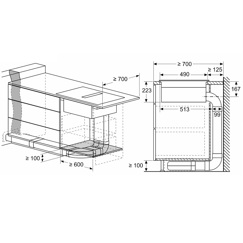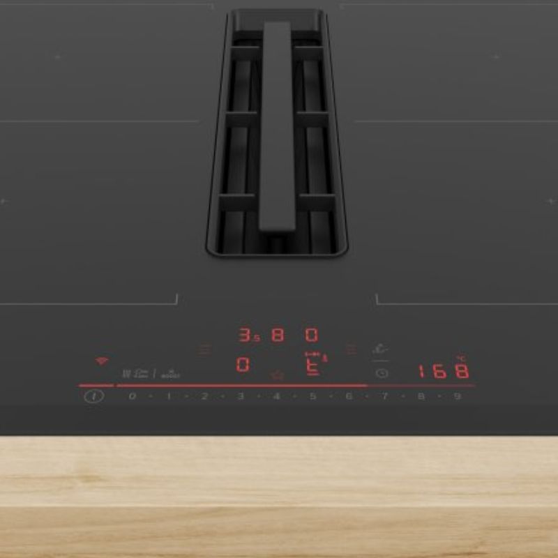 Hotte intégrée à la table de cuisson: vapeur et odeurs sont aspirées directement à la source.