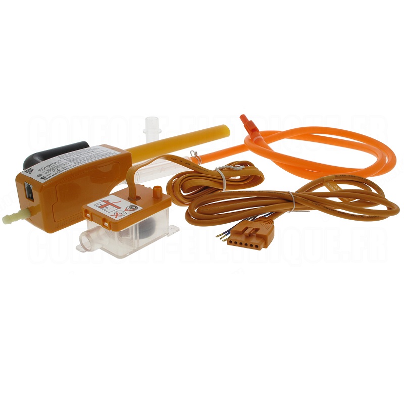 Pompe Mini Orange Silence+, câble d'alimentation de 1,5 m, absorbeur acoustique et tuyau d’évacuation orange de 1 m avec raccord, support anti-vibration, réservoir, couvercle de réservoir avec câble capteur de1,5 m, réservoir submersible, anti-siphon, flotteur et filtre, tuyau d'aspiration de 1,5 m, diam. int. de 6 mm, tuyau souple orange de 220 mm, diam. int. de 14 mm, tube d’évent en vinyle de 150 mm, diam. int. de 6 mm, ensemble de raccord d’évacuation, ensemble de fixation, notice d'installation