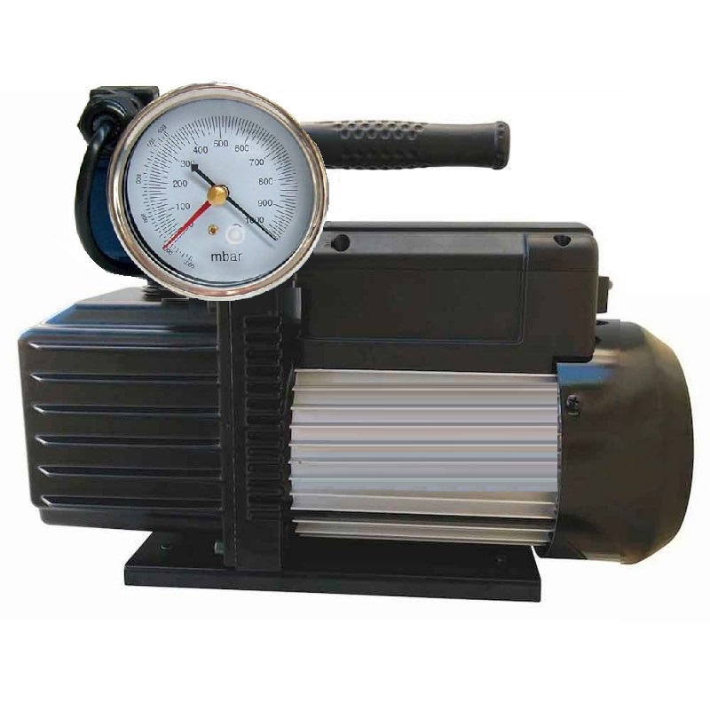 Pompe à vide 2 étages avec vacuomètre et solénoïde, d'une puissance de 1/3 CV, 250W, 0,7 litres/a. 2,50 m/h, vitesse de pompage 1,5 cfm. 1440 tr/min. 15 microns (2 pa).
