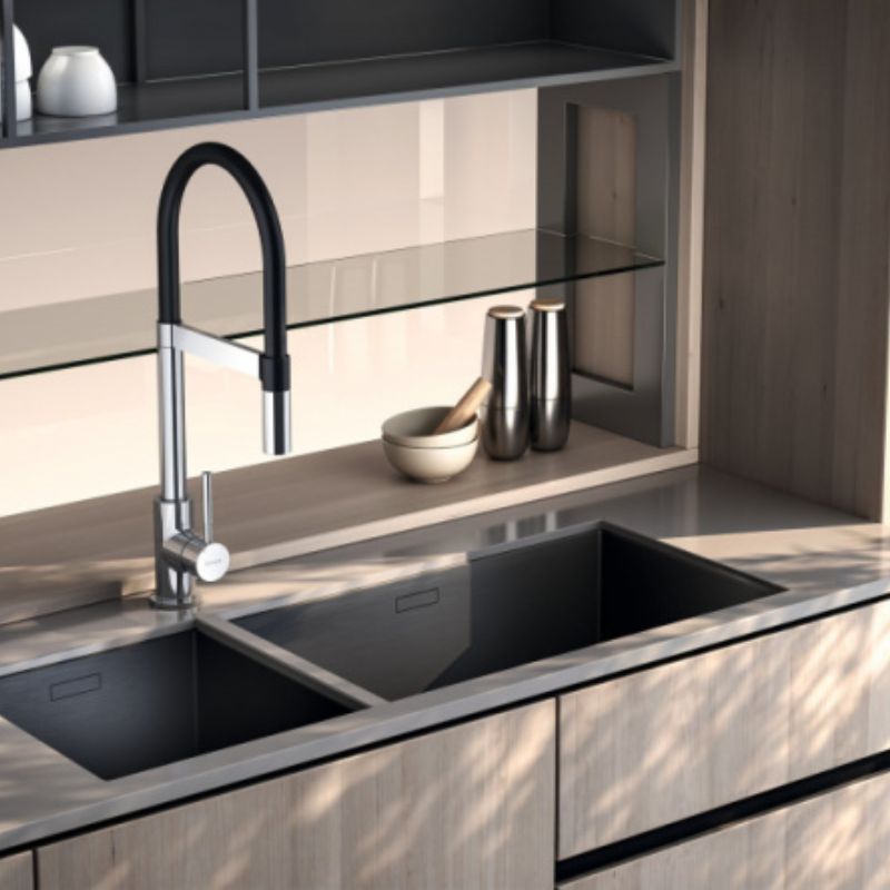 Un système double eau en une seule application, avec un levier unique actionné par un bec bifonctionnel, permet de distribuer l'eau filtrée et l'eau du robinet sans mélange. Équipé d'une cartouche de 35 mm de diamètre à double fonction : eau filtrée et eau du robinet en un seul levier. Il est doté d'un bec flexible en silicone pour une utilisation confortable et d'un système d'ancrage magnétique qui fixe le tuyau au robinet.