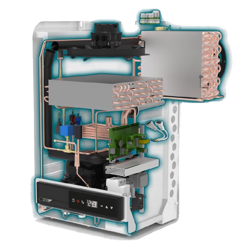 Condenseur avec tubes Ø5mm avec nervures hélicoïdales internes Évaporateur avec tubes Ø5/16” avec nervures hélicoïdales internes Motoventilateurs électroniques dans le condenseur et l'évaporateur Vanne thermostatique mécanique de série sur toute la gamme Dégivrage par gaz chauds