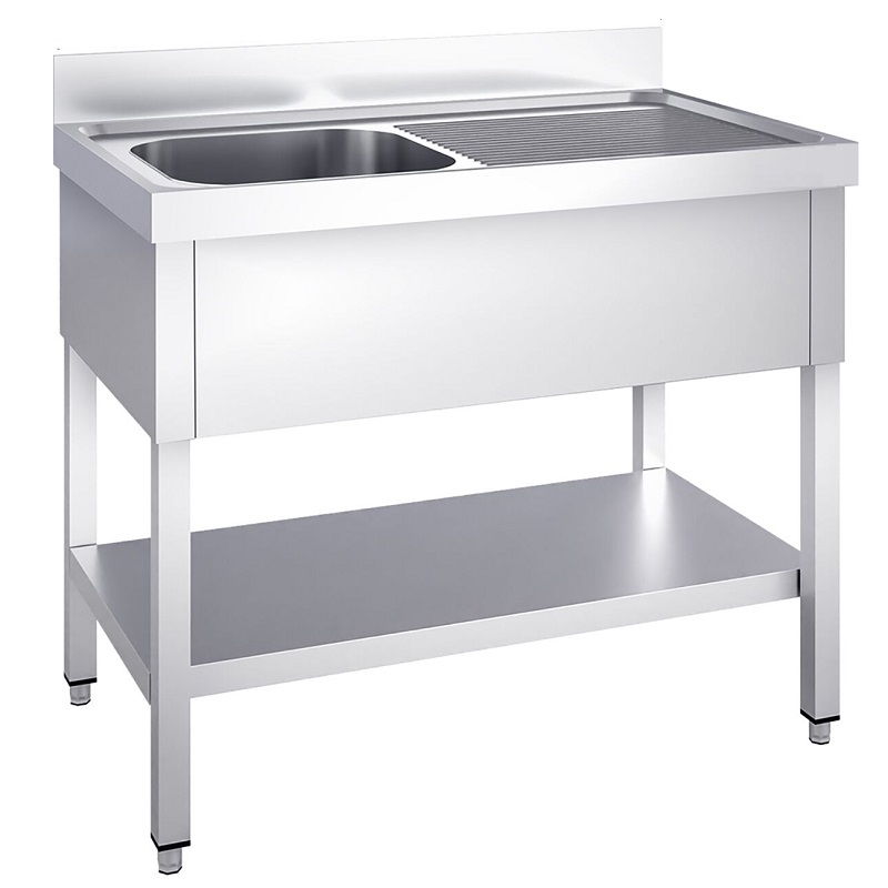 Plonge en acier inoxydable avec évier se trouvant sur la droite ou sur la gauche de la table et une étagère de rangement de la marque Gredil
