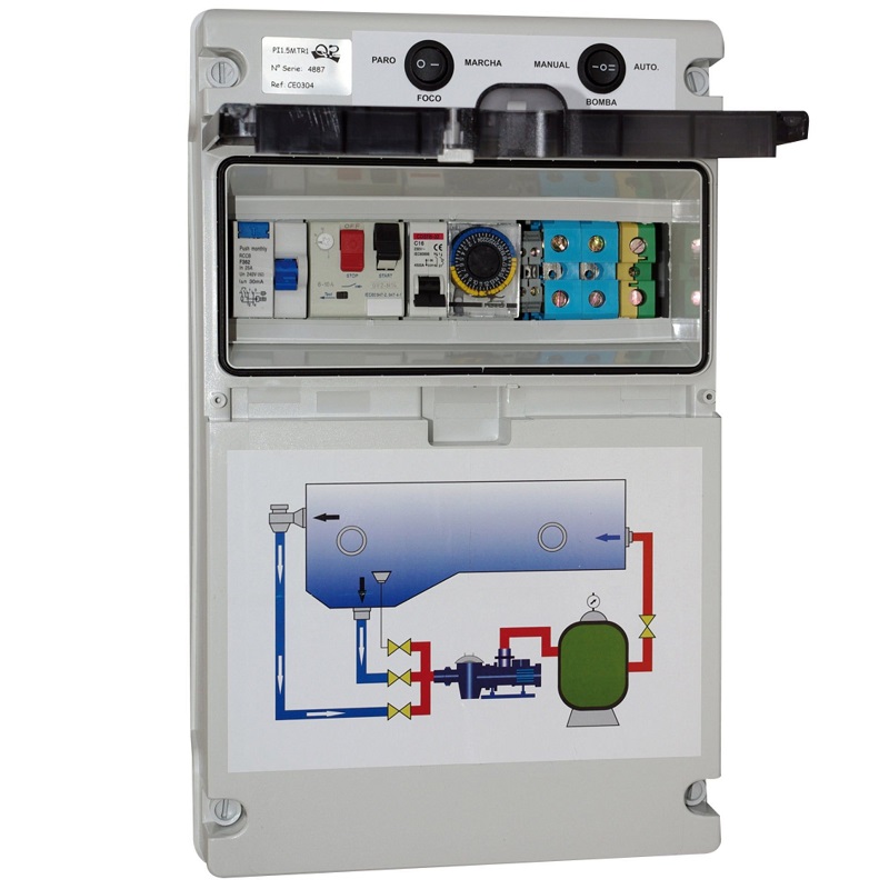 Ce panneau électrique est la solution idéale pour contrôler et protéger la pompe de filtration de votre piscine, comprend un protecteur de moteur pour une pompe de 0,75-1 CV (vérifiez le CV de votre pompe de filtration), un différentiel de sécurité de 25 A et une horloge pour le contrôle automatique, de plus il dispose d'un transformateur de 300W pour alimenter le système d'éclairage LED de votre piscine.
