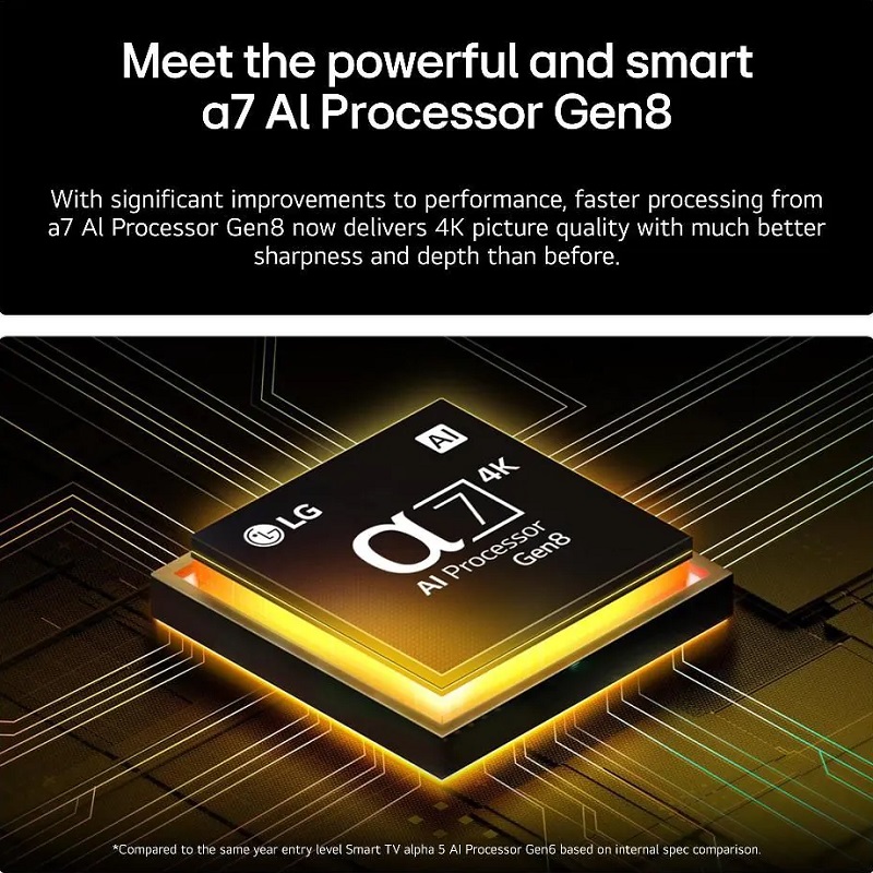 Le LG QNED87A intègre le tout dernier processeur α8 AI, véritable cerveau du téléviseur. Ce processeur intelligent utilise certaines des technologies de pointe présentes dans nos téléviseurs OLED haut de gamme pour garantir une qualité d'image et de son optimale, grâce à la Super Upscaling IA pour des images nettes et à l'IA Sound Pro pour un son immersif. Le téléviseur 50/43" est équipé d'un processeur α7 AI et de la technologie Super Upscaling 4K.