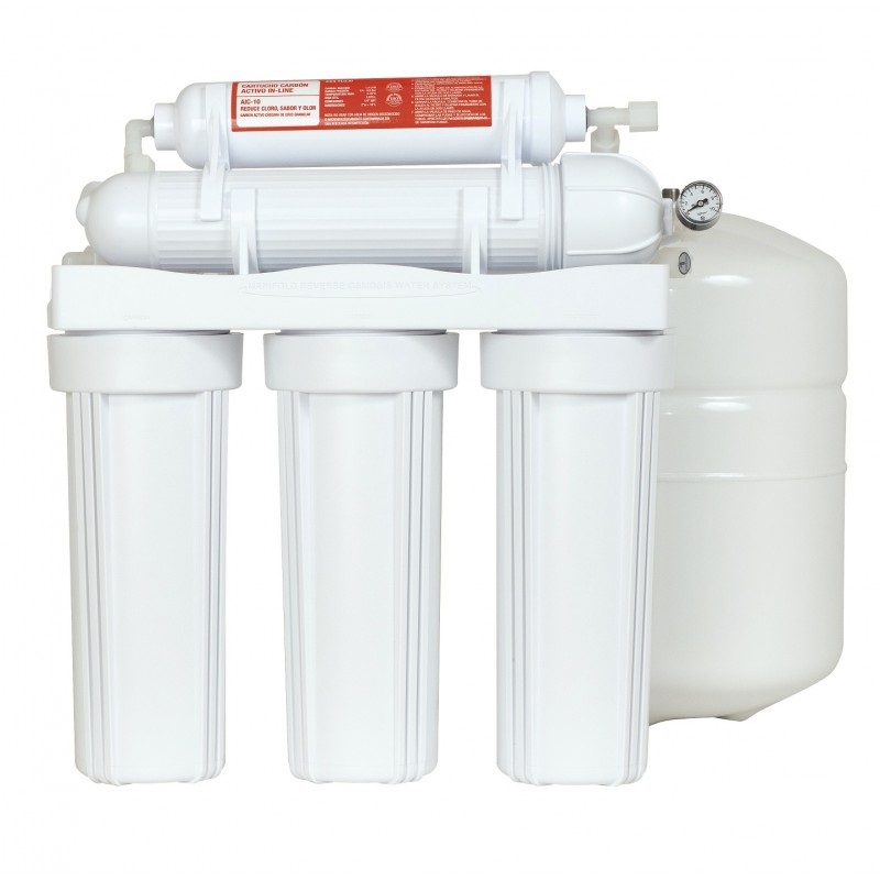 O.I. 5 étapes. Filtration + déchloration UDF + déchloration CTO + membrane O.I. + GAC en ligne.