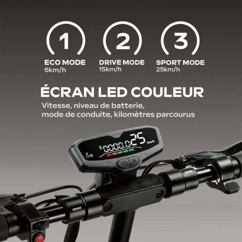 Ecran LCD extralarge avec vitesse, niveau de batterie, modes